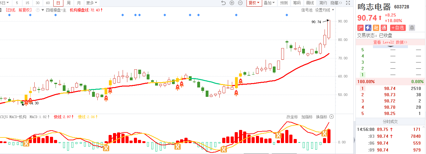 1)鸣志电器-四维操盘-近期出现火箭信号且底部量柱由绿转红