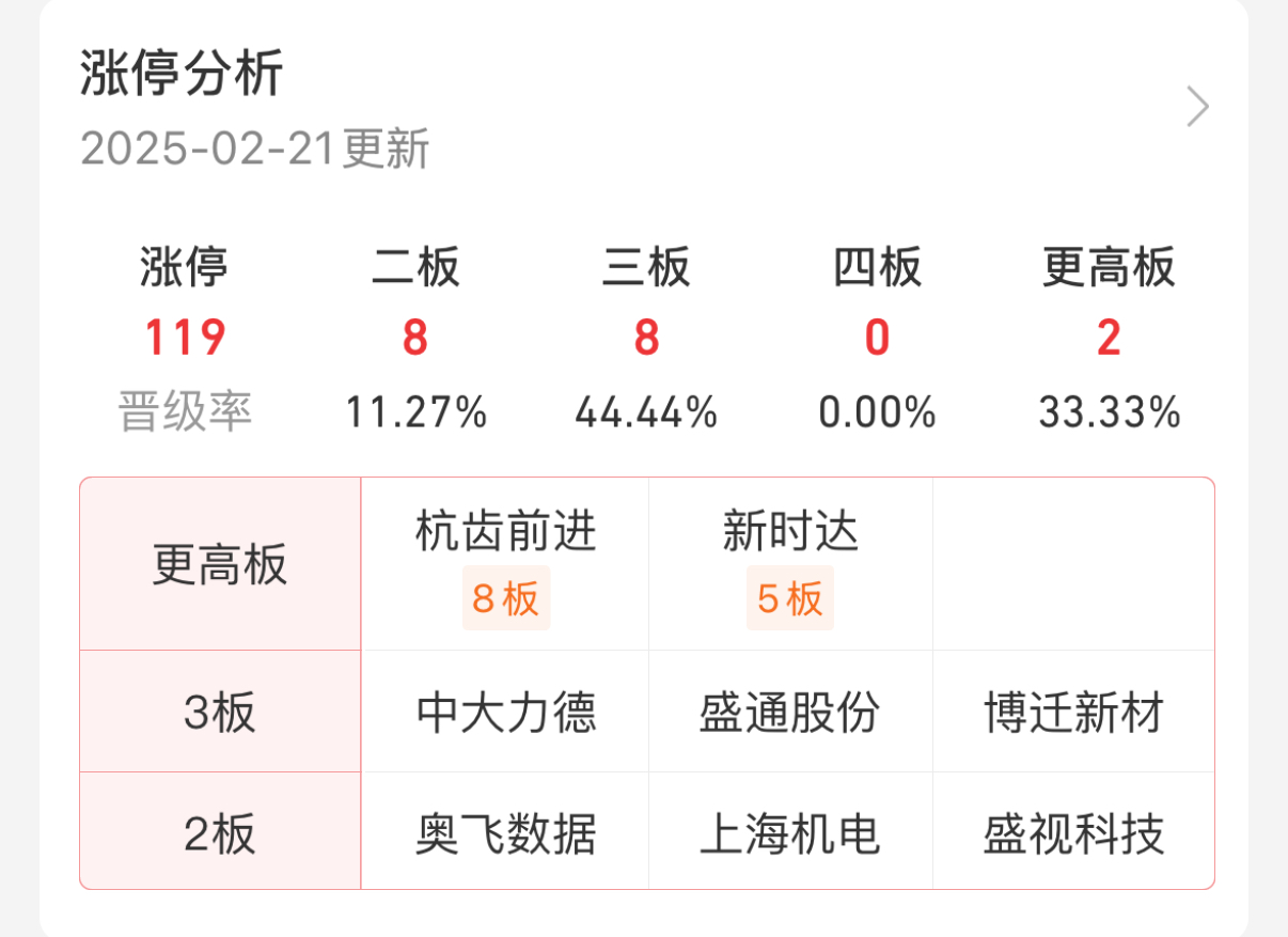 现在市场高标,8板的航齿前进和5板的新时达,其他最高板也就3连板。所以下周市场想要往上,连板妖股必须开始干活了。5板的股票多了,低位的票涨的才会更加凶猛。