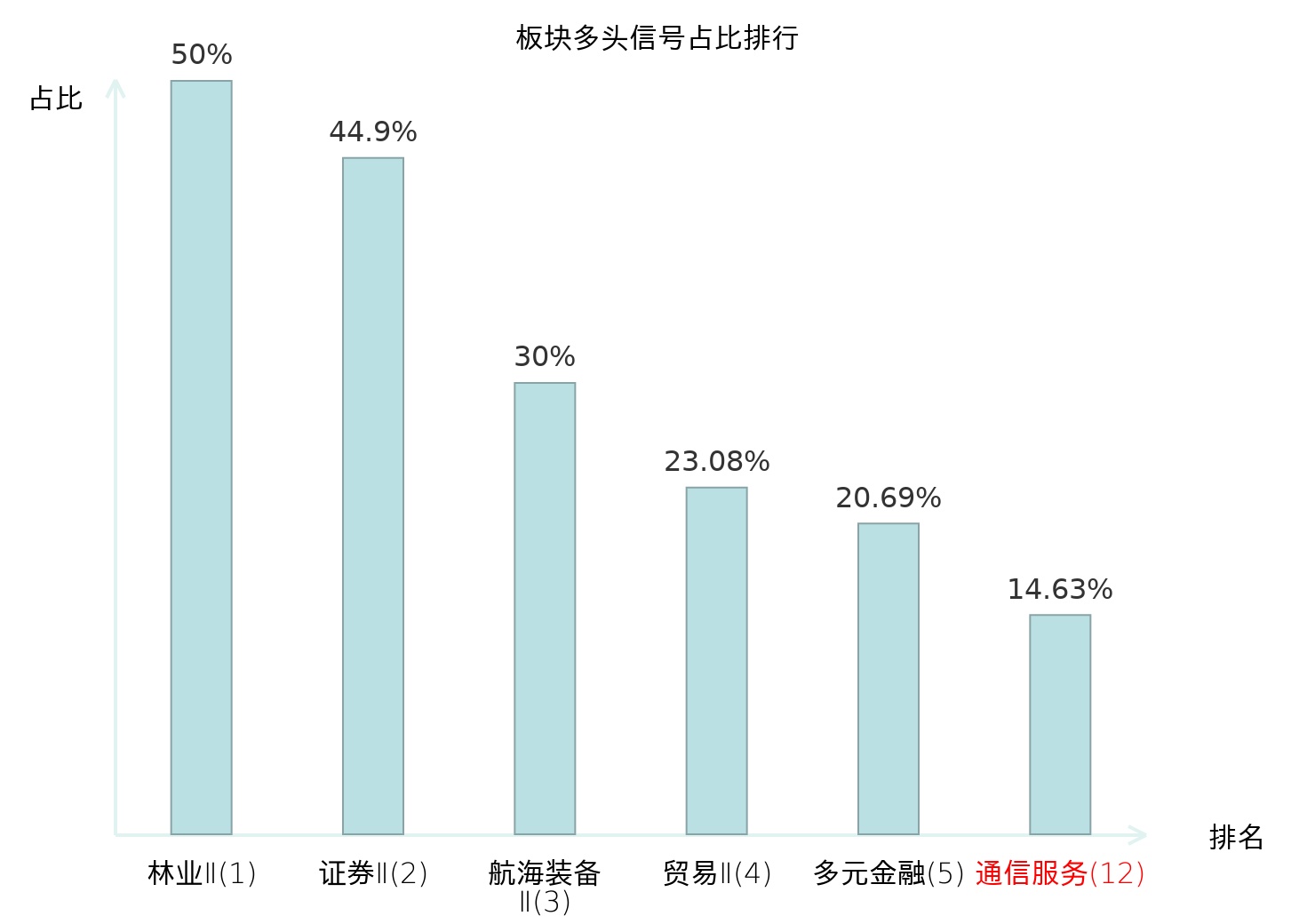 全市场所有行业板块中主力多头信号占比排名中,林业Ⅱ板块位居第一。林业Ⅱ板块名次提升最快,较昨日上升125位。