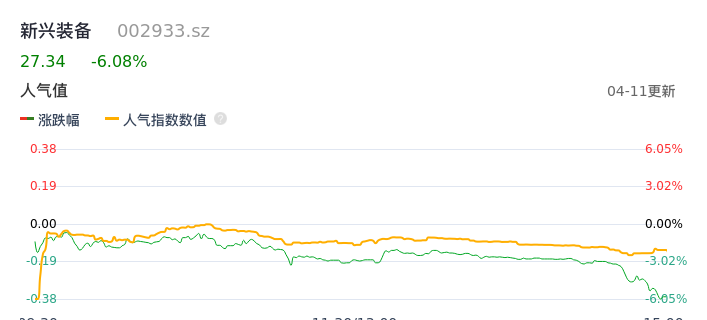 04月11日,新兴装备收报27.34,股价涨幅-6.08%,成交金额1.31亿元,换手率4.08%。