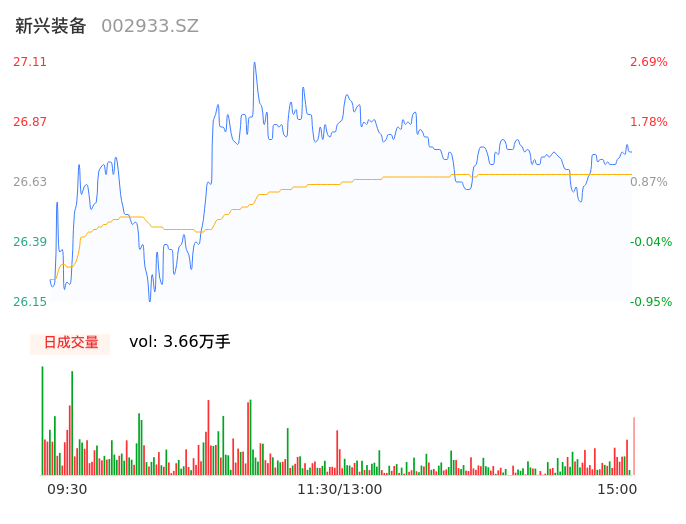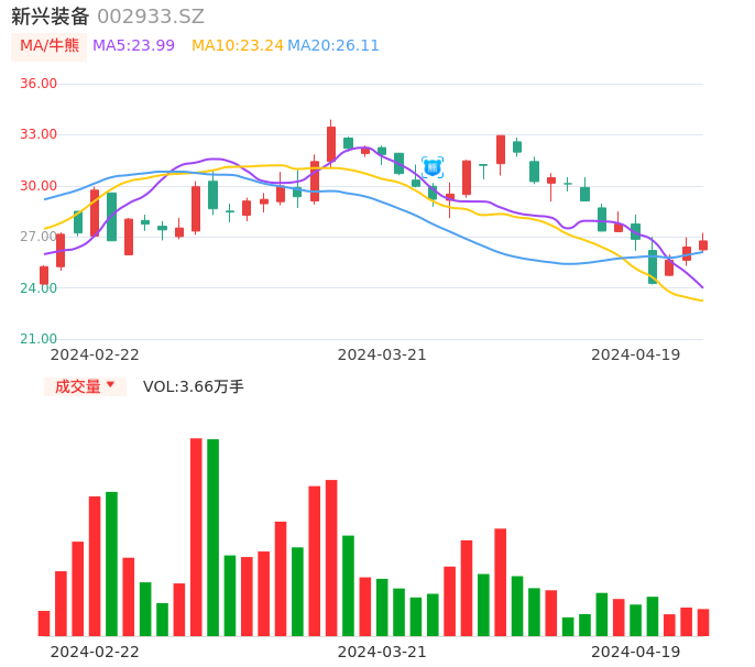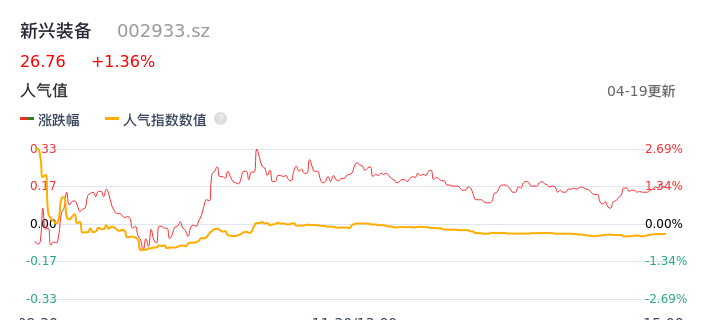 04月19日,新兴装备收报26.76,股价涨幅1.36%,成交金额9754.88万元,换手率3.21%。