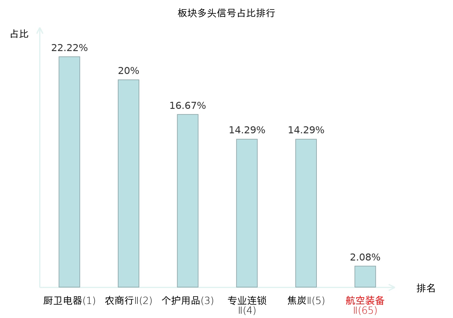 全市场所有行业板块中主力多头信号占比排名中,厨卫电器板块位居第一。专业连锁Ⅱ板块名次提升最快,较昨日上升117位。