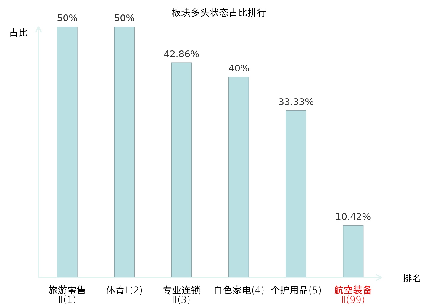 全市场所有行业板块中主力多头状态占比排名中,旅游零售Ⅱ板块位居第一。化学原料板块名次提升最快,较昨日上升35位。