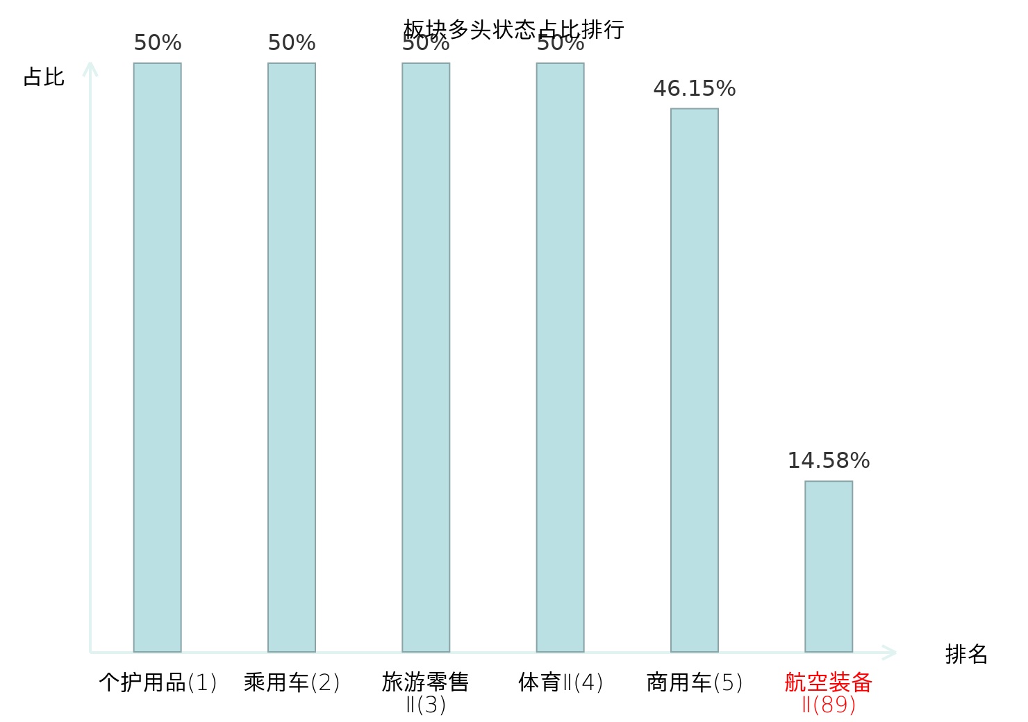全市场所有行业板块中主力多头状态占比排名中,个护用品板块位居第一。林业Ⅱ板块名次提升最快,较昨日上升94位。