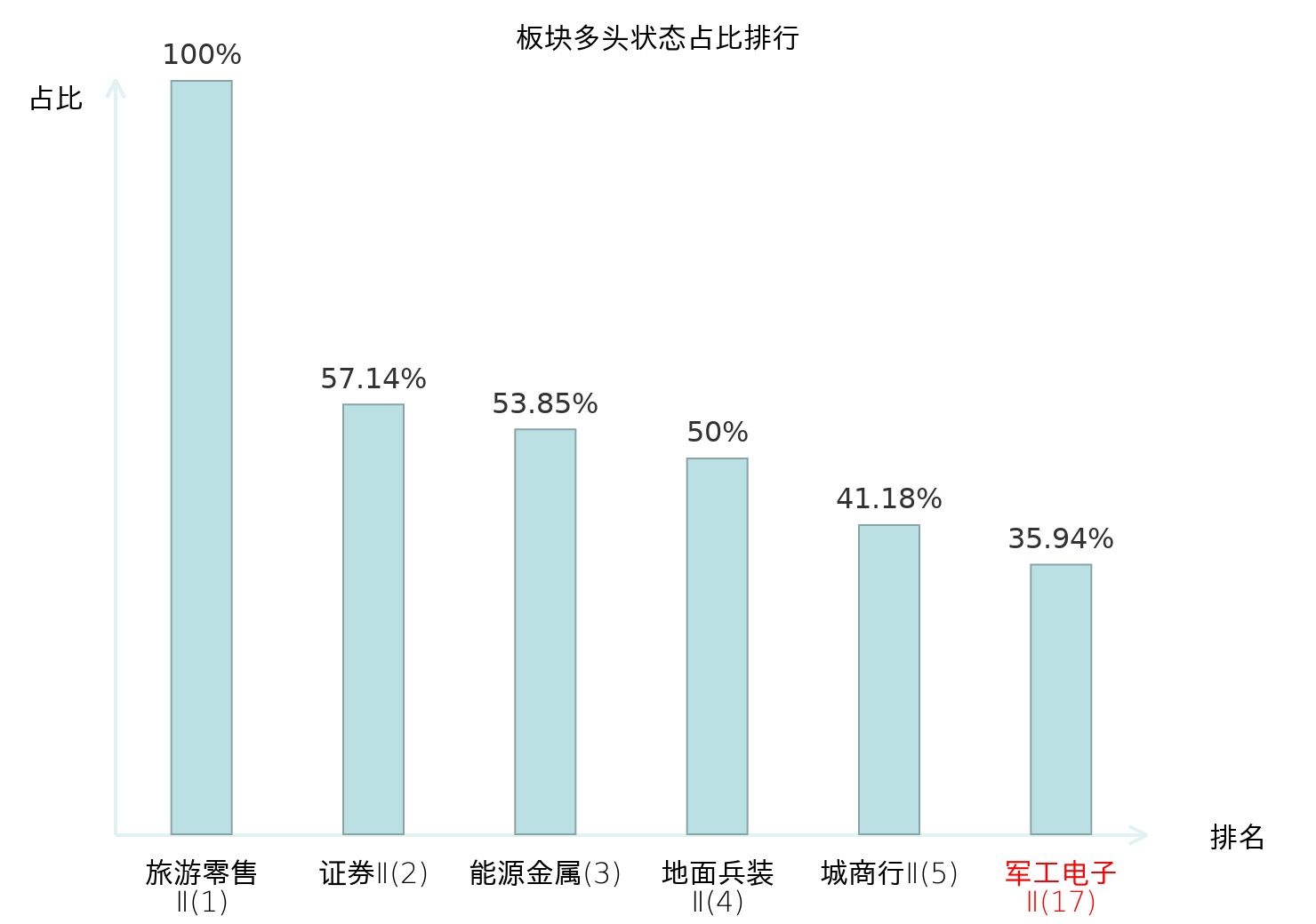 全市场所有行业板块中主力多头状态占比排名中,旅游零售Ⅱ板块位居第一。渔业板块名次提升最快,较昨日上升57位。