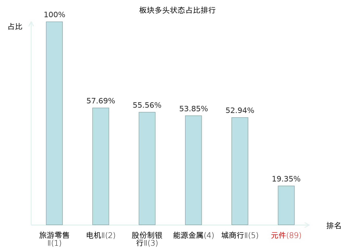 全市场所有行业板块中主力多头状态占比排名中,旅游零售Ⅱ板块位居第一。地面兵装Ⅱ板块名次提升最快,较昨日上升99位。