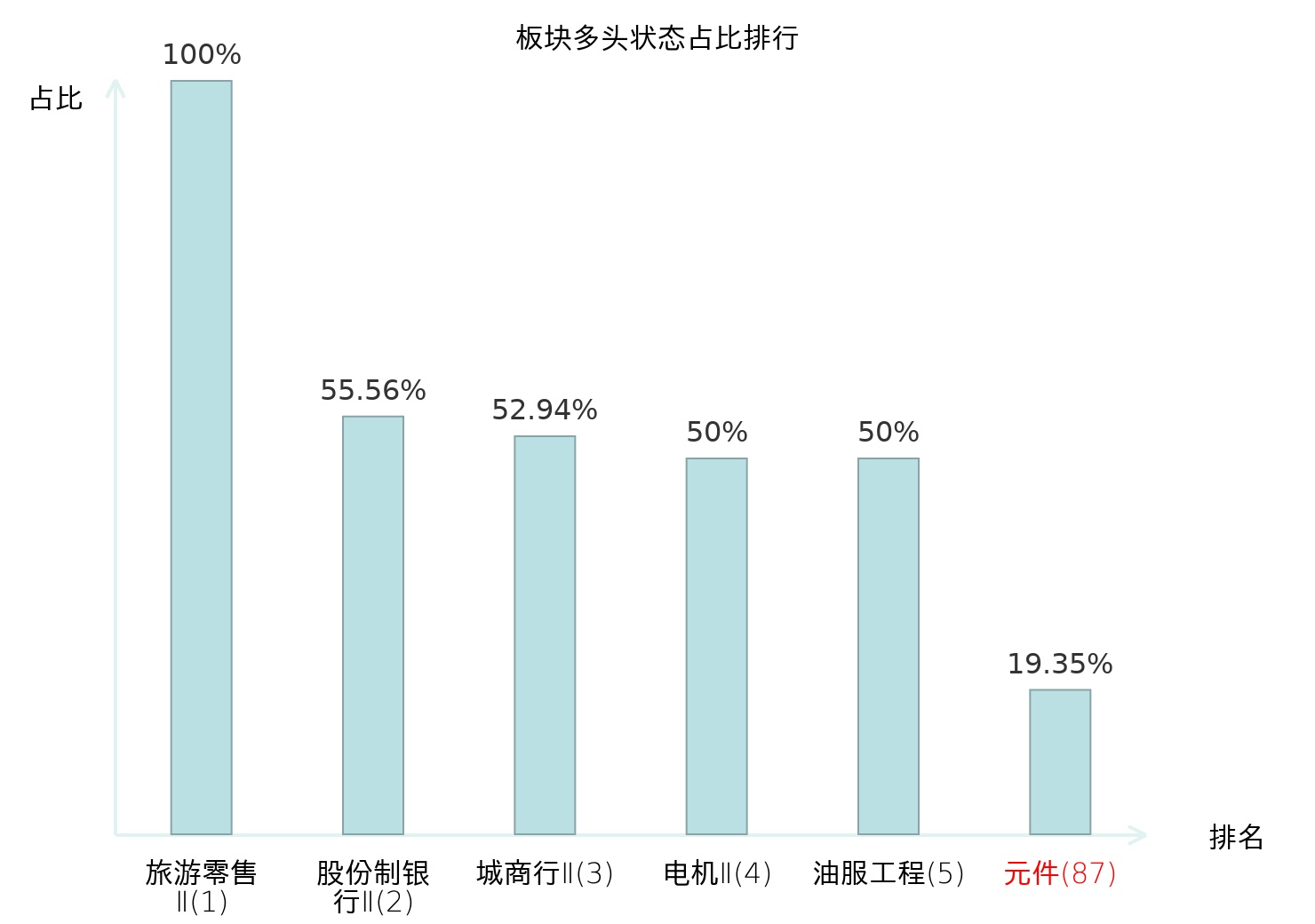 全市场所有行业板块中主力多头状态占比排名中,旅游零售Ⅱ板块位居第一。互联网电商板块名次提升最快,较昨日上升65位。