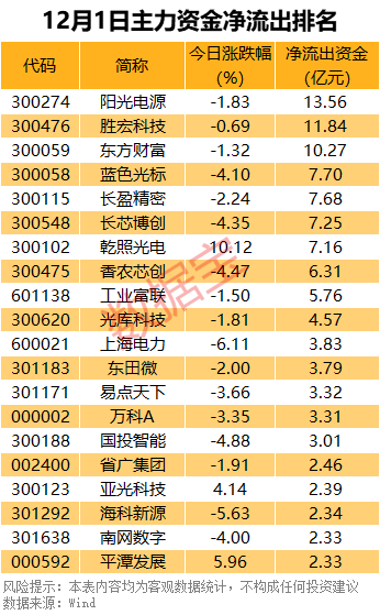 据数据宝统计,78股主力资金净流出超1亿元,其中9股净流出金额超5亿元。其中,阳光电源、胜宏科技、东方财富净流出资金居前,均超10亿元。