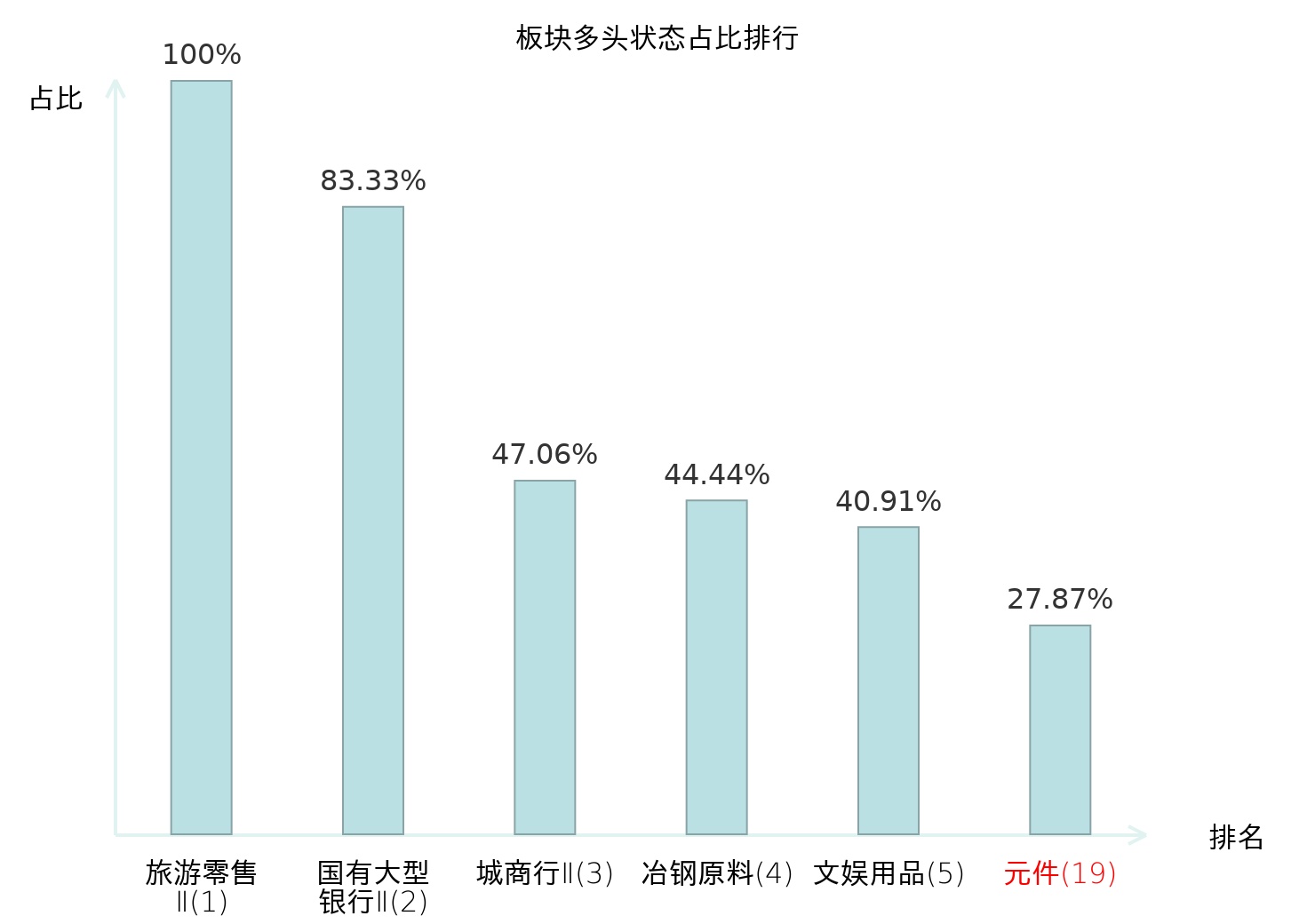 全市场所有行业板块中主力多头状态占比排名中,旅游零售Ⅱ板块位居第一。旅游零售Ⅱ板块名次提升最快,较昨日上升130位。