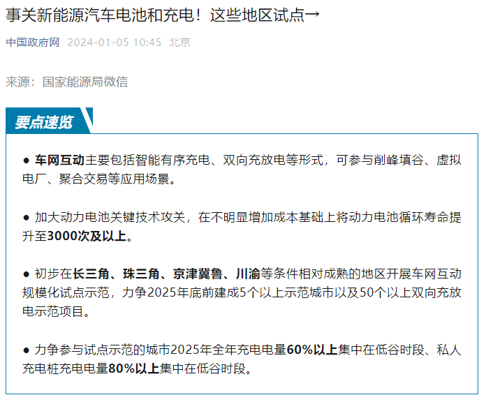 该意见还提出,初步在长三角、珠三角、京津冀鲁、川渝等条件相对成熟的地区开展车网互动规模化试点示范,力争2025年底前建成5个以上示范城市以及50个以上双向充放电示范项目。总体目标是,到2025年,我国车网互动技术标准体系初步建成。
