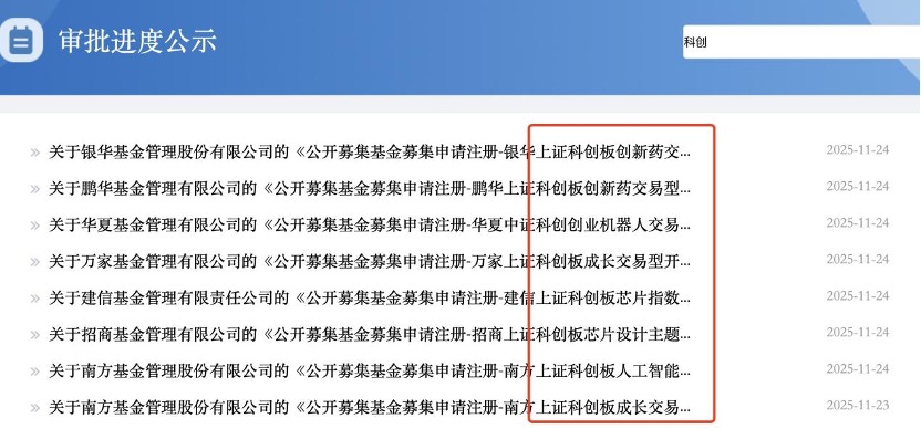 在7只中证科创创业人工智能ETF获批后,激发了基金公司对科创板块布局,仅11月24日,就有包括银华、鹏华、华夏、万家、建信、招商、南方等基金公司上报包括科创板创新药ETF、科创板机器人ETF、科创板芯片指数、科创板芯片设计主题ETF、科创板成长ETF等相关产品。