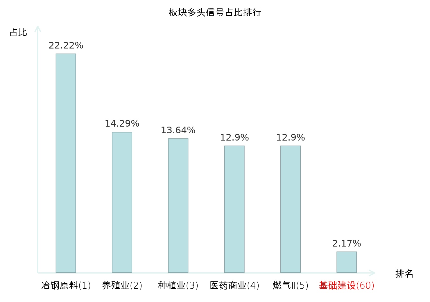 全市场所有行业板块中主力多头信号占比排名中,冶钢原料板块位居第一。航天装备Ⅱ板块名次提升最快,较昨日上升114位。
