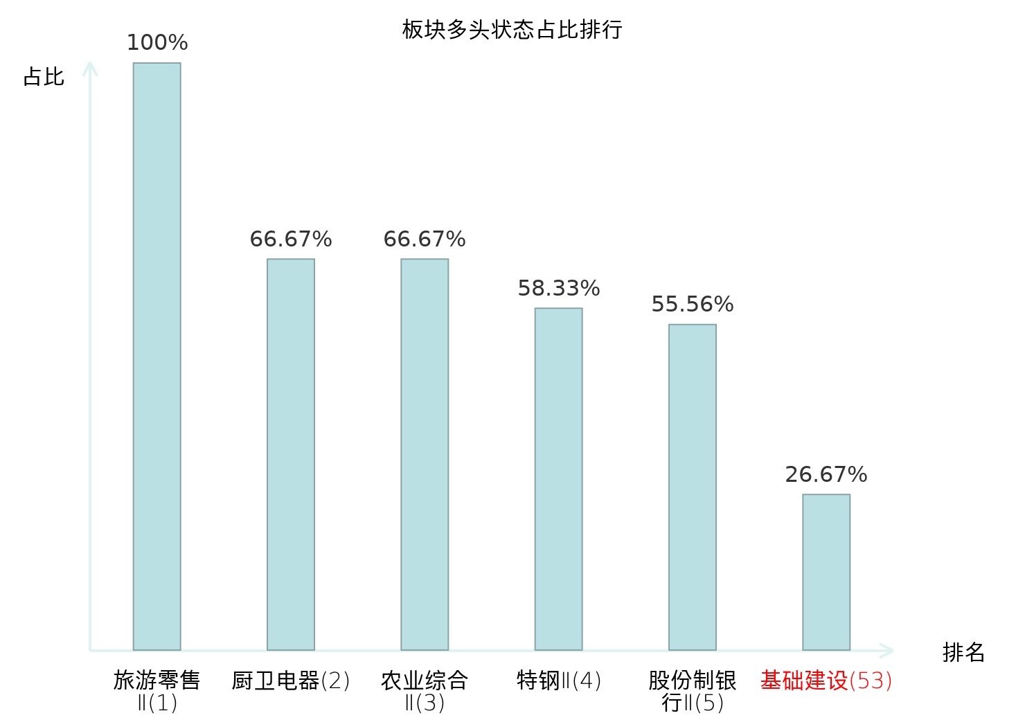 全市场所有行业板块中主力多头状态占比排名中,旅游零售Ⅱ板块位居第一。农商行Ⅱ板块名次提升最快,较昨日上升78位。