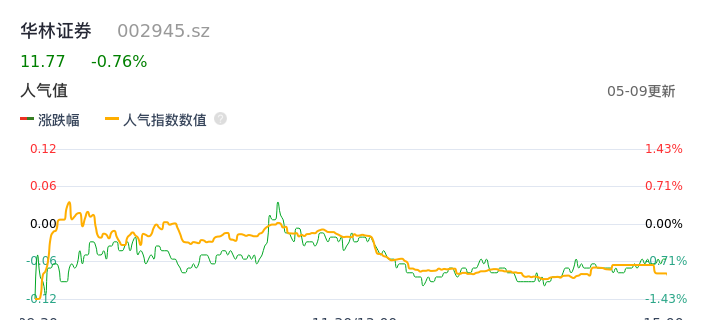 05月09日,华林证券收报11.77,股价涨幅-0.76%,成交金额2.05亿元,换手率0.64%。