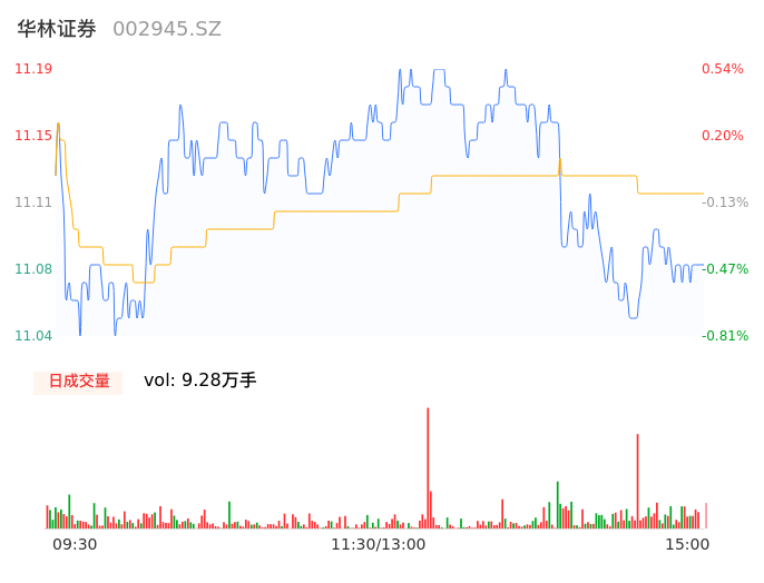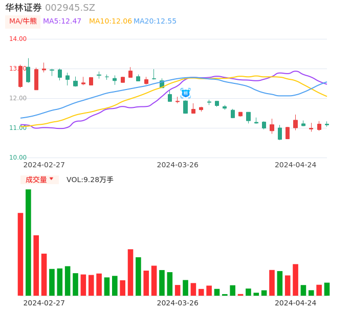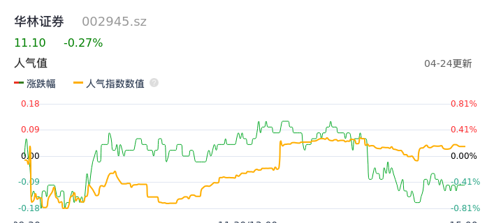 04月24日,华林证券收报11.10,股价涨幅-0.27%,成交金额1.03亿元,换手率0.34%。