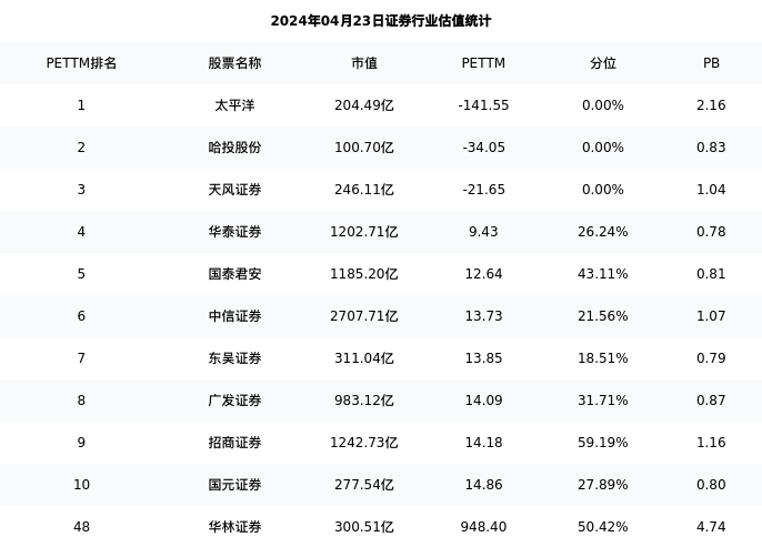 从估值角度看:华林证券最新市盈率PETTM为948.40,在行业内排名45/50,处于50.42分位。