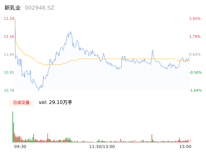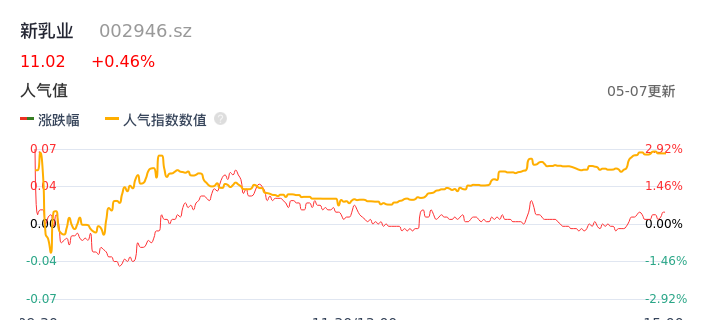 05月07日,新乳业收报11.02,股价涨幅0.46%,成交金额3.20亿元,换手率3.42%。