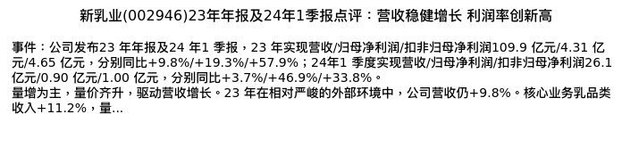值得注意的是:2024年04月西部证券的张弛分析师,首次发布关于新乳业的研究报告,标题为:新乳业(002946)23年年报及24年1季报点评:营收稳健增长 利润率创新高。