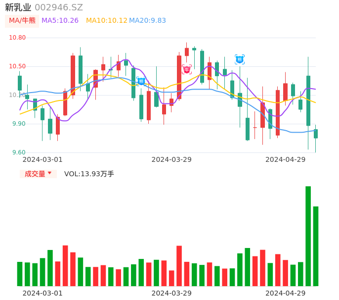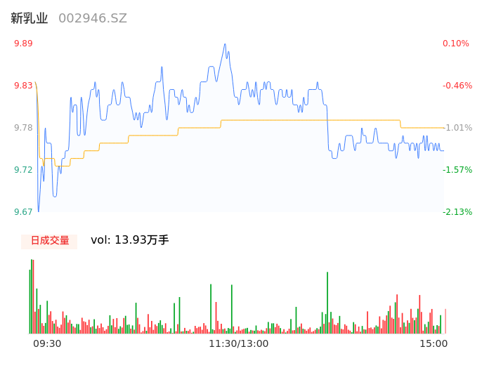 04月29日,新乳业收报9.75,股价涨幅-1.32%,成交金额1.36亿元,换手率1.64%。