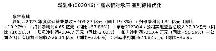 值得注意的是:2024年05月长江证券的董思远/徐爽分析师,首次发布关于新乳业的研究报告,标题为:新乳业(002946):需求相对承压 盈利保持优化。