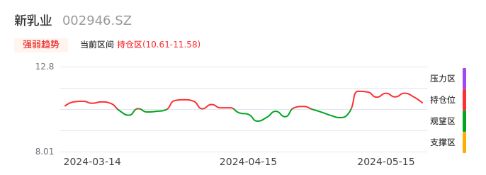 我们来看一下该股的九方特色指标强弱趋势的情况:新乳业自05月06日从观望区上穿到持仓区。股价近期在多头区域回调整理。后续重点关注多空分界点的争夺:10.61元。如未能有效站稳则可能重新回到空头行情。