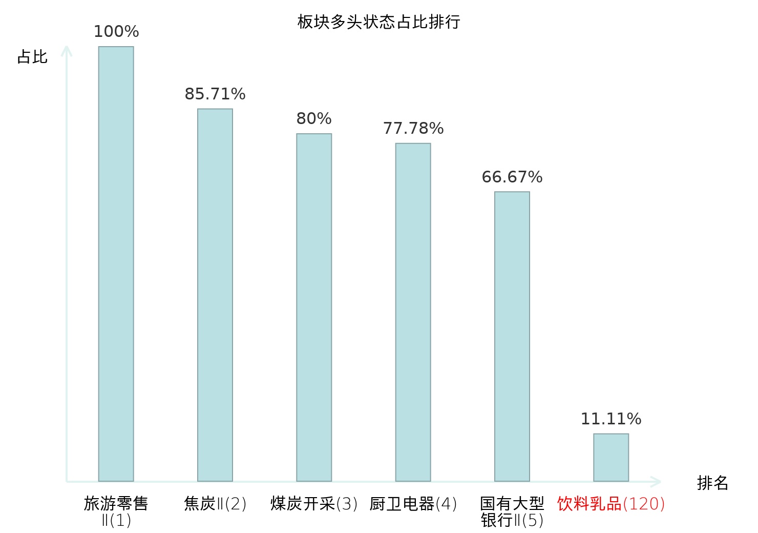 全市场所有行业板块中主力多头状态占比排名中,旅游零售Ⅱ板块位居第一。渔业板块名次提升最快,较昨日上升66位。