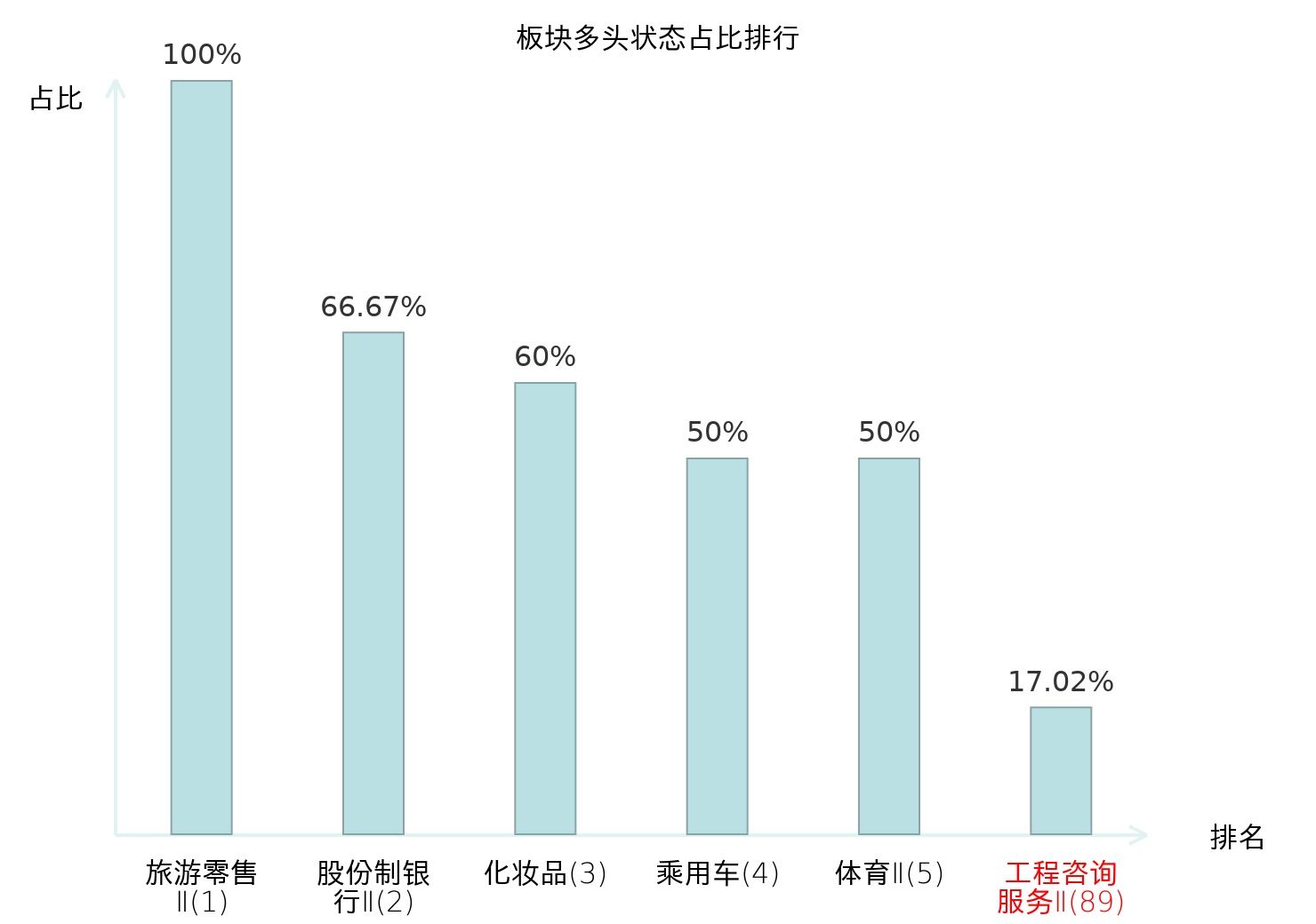 全市场所有行业板块中主力多头状态占比排名中,旅游零售Ⅱ板块位居第一。旅游零售Ⅱ板块名次提升最快,较昨日上升130位。