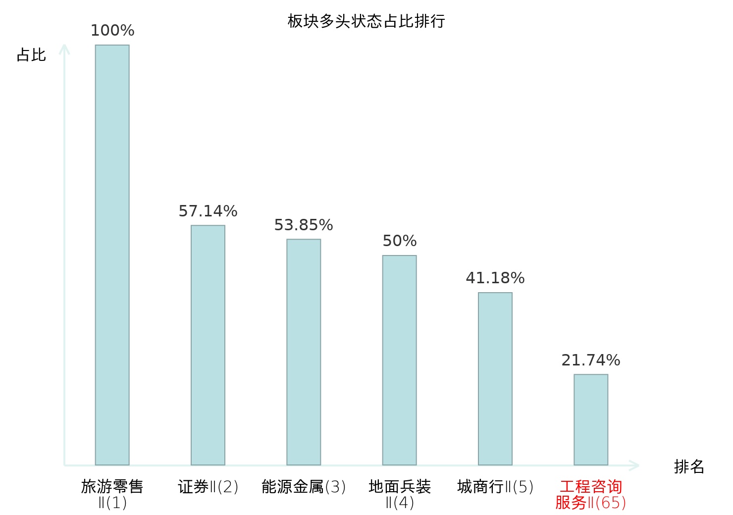 全市场所有行业板块中主力多头状态占比排名中,旅游零售Ⅱ板块位居第一。渔业板块名次提升最快,较昨日上升57位。