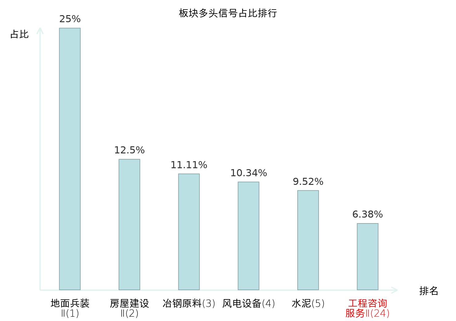 全市场所有行业板块中主力多头信号占比排名中,地面兵装Ⅱ板块位居第一。房屋建设Ⅱ板块名次提升最快,较昨日上升117位。