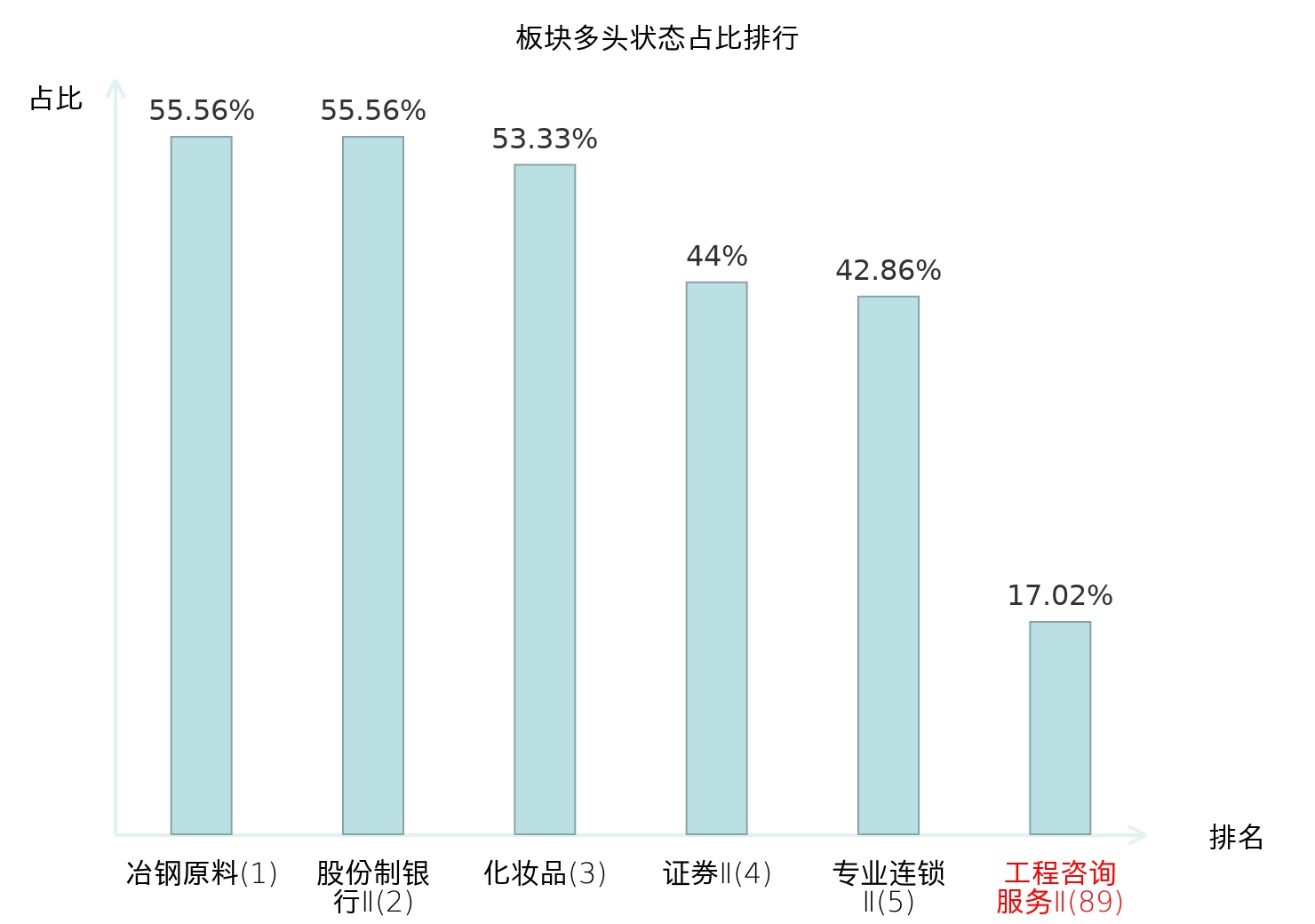 全市场所有行业板块中主力多头状态占比排名中,冶钢原料板块位居第一。保险Ⅱ板块名次提升最快,较昨日上升114位。