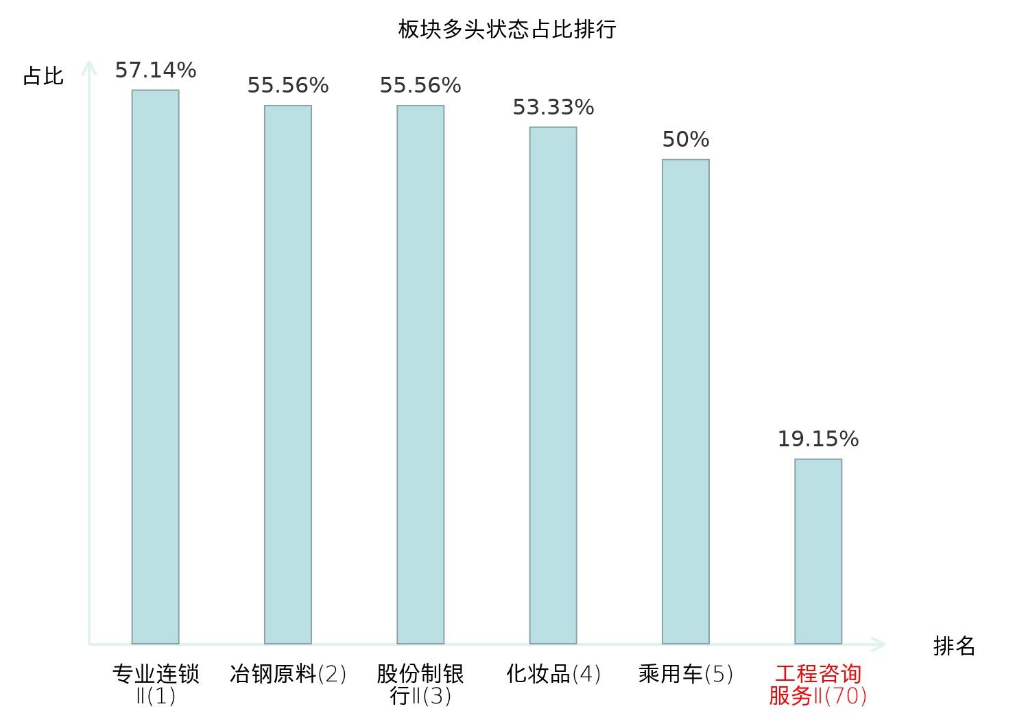 全市场所有行业板块中主力多头状态占比排名中,专业连锁Ⅱ板块位居第一。房地产服务板块名次提升最快,较昨日上升52位。