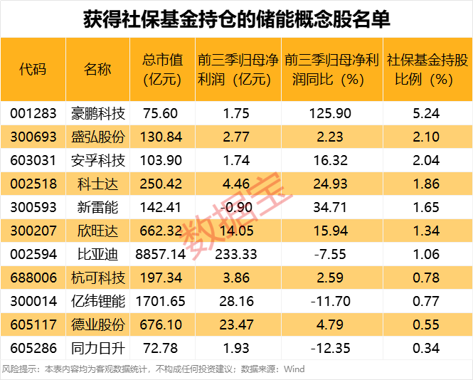 截至三季度末,11只储能概念股获得社保基金持仓,豪鹏科技、盛弘股份、安孚科技、科士达等持股比例居前。
