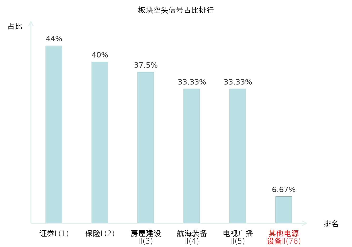 全市场所有行业板块中主力空头信号占比排名中,证券Ⅱ板块位居第一。证券Ⅱ板块名次提升最快,较昨日上升125位。