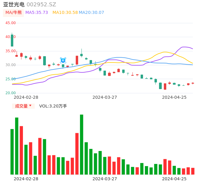 04月25日,亚世光电收报23.61,股价涨幅0.81%,成交金额7542.74万元,换手率2.42%。