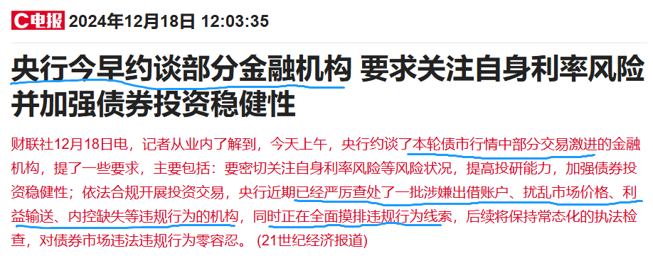 这个是今天上午的新闻,中国央行约谈了本轮债市大牛市行情中部分交易激进的金融机构,包括部分银行、券商、保险资管、理财子公司、基金、信托等等。据说,这些被谈话的机构,一致特点是在12月以来的债券大牛行情中表现“突出”,仓位激进。此次央行态度很严厉,已经严厉查处了一批机构,如果某些机构后续还是不听话,后果可能超出它们的预期。