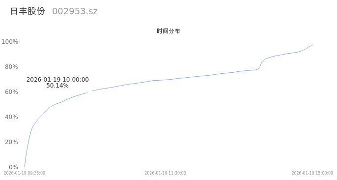 002953日丰股份2026年01月19日成交71.33万手,成交金额9.91亿,相较昨日放量51.03万手,换手率33.54%,成交活跃。