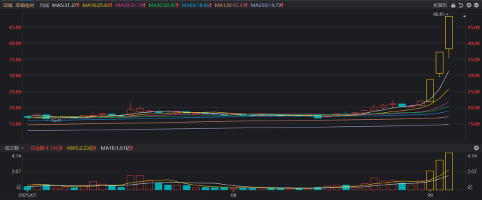 财联社9月3日讯(编辑 梓隆),今日(9月3日),北证人气股宏裕包材再获长阳涨停,截至收盘,其已连续录得3个30cm涨停,期间累计涨幅近120%。同时,其股价也续刷历史新高,并逼近50元关口。
