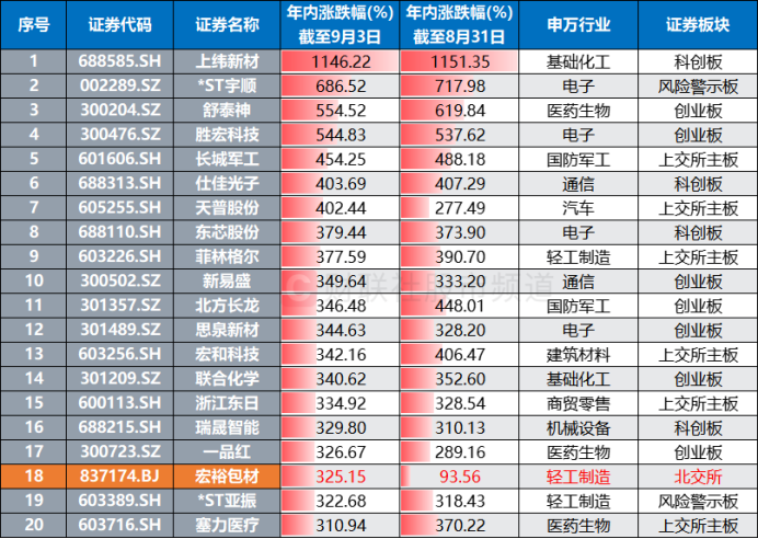 今年以来,宏裕包材股价持续震荡上升,截至8月底,其年内涨幅累计近93.56%,跑赢超7成北证A股同期涨幅。进入9月后,宏裕包材再度发力,接连迎来3个30cm涨停,截至今日(9月3日)收盘,其年内涨幅一举扩大至325.15%,在北证A股中位居第一(不计算年内上市新股),同时在整个A股中位列第18位,相当于跑赢99.7%市场个股同期涨幅。