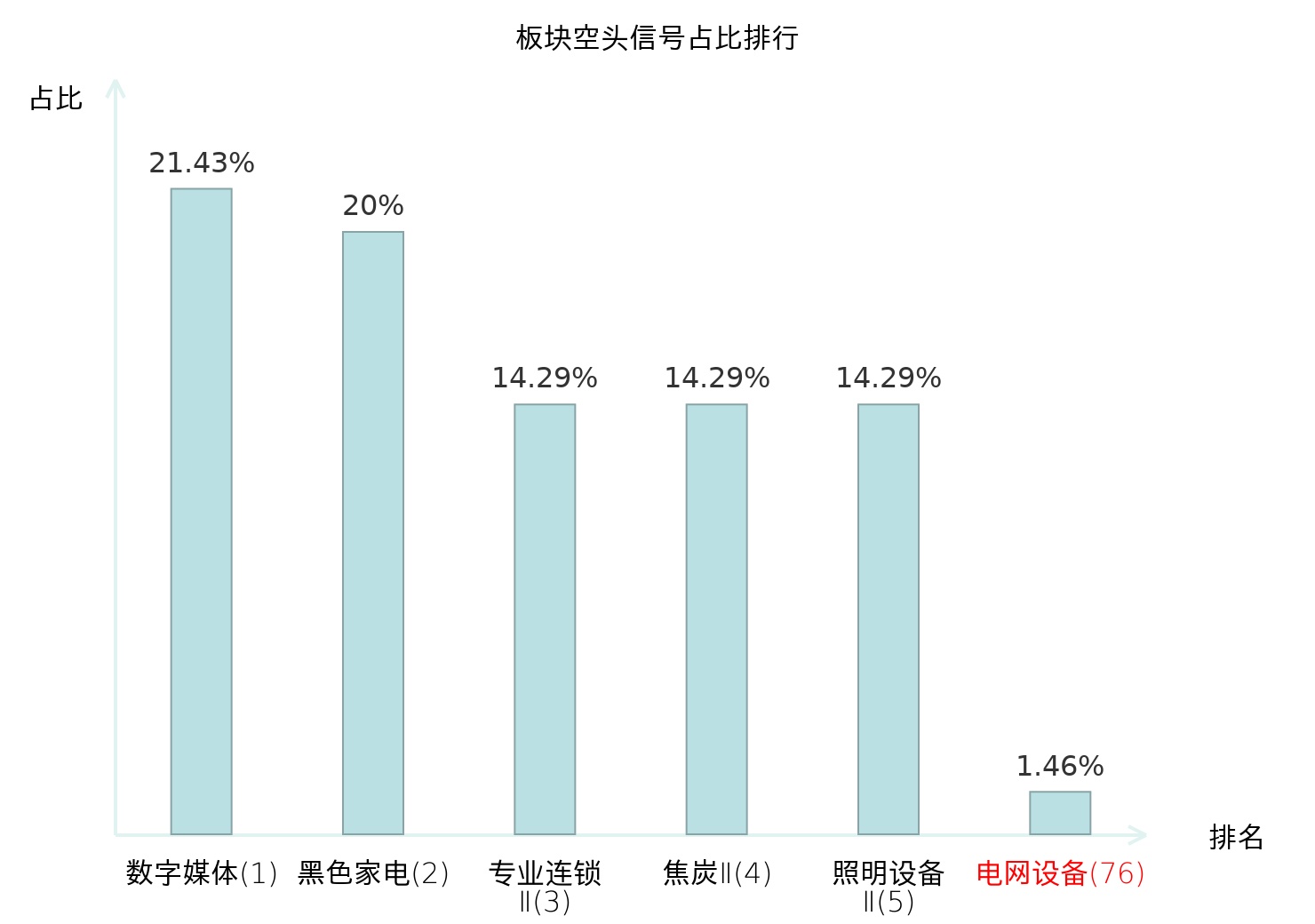 全市场所有行业板块中主力空头信号占比排名中,数字媒体板块位居第一。装修装饰Ⅱ板块名次提升最快,较昨日上升110位。