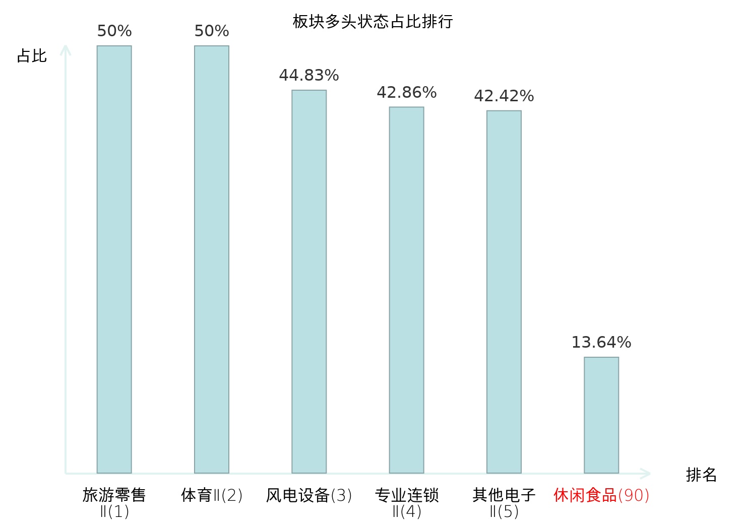 全市场所有行业板块中主力多头状态占比排名中,旅游零售Ⅱ板块位居第一。化妆品板块名次提升最快,较昨日上升66位。