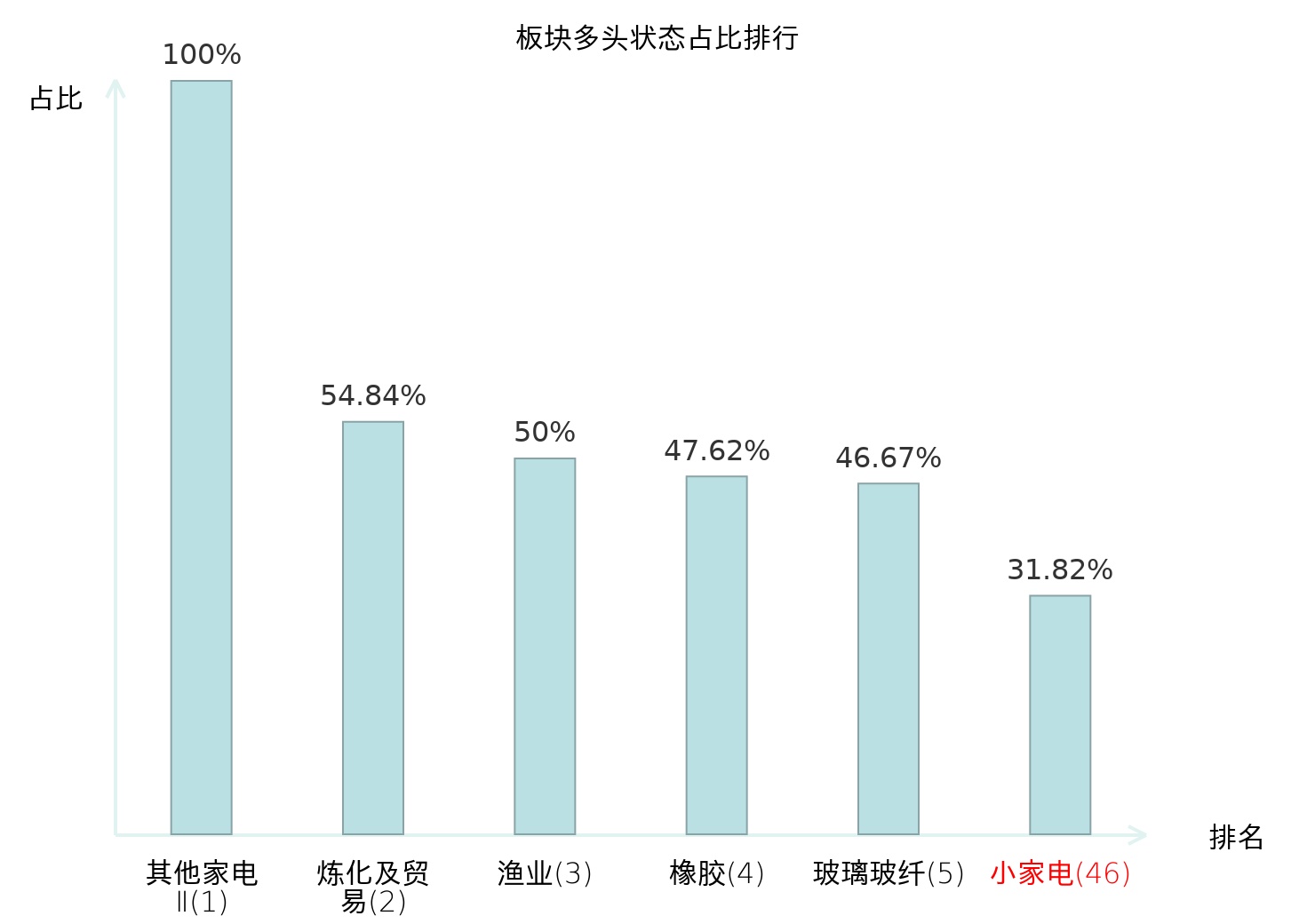 全市场所有行业板块中主力多头状态占比排名中,其他家电Ⅱ板块位居第一。铁路公路板块名次提升最快,较昨日上升37位。