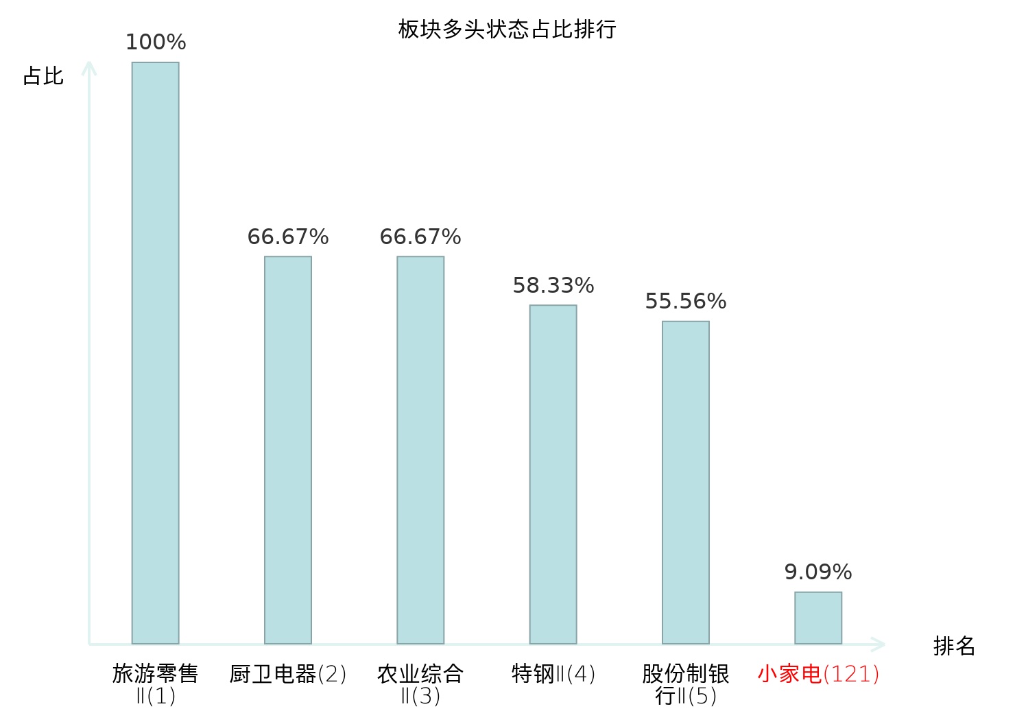 全市场所有行业板块中主力多头状态占比排名中,旅游零售Ⅱ板块位居第一。农商行Ⅱ板块名次提升最快,较昨日上升78位。