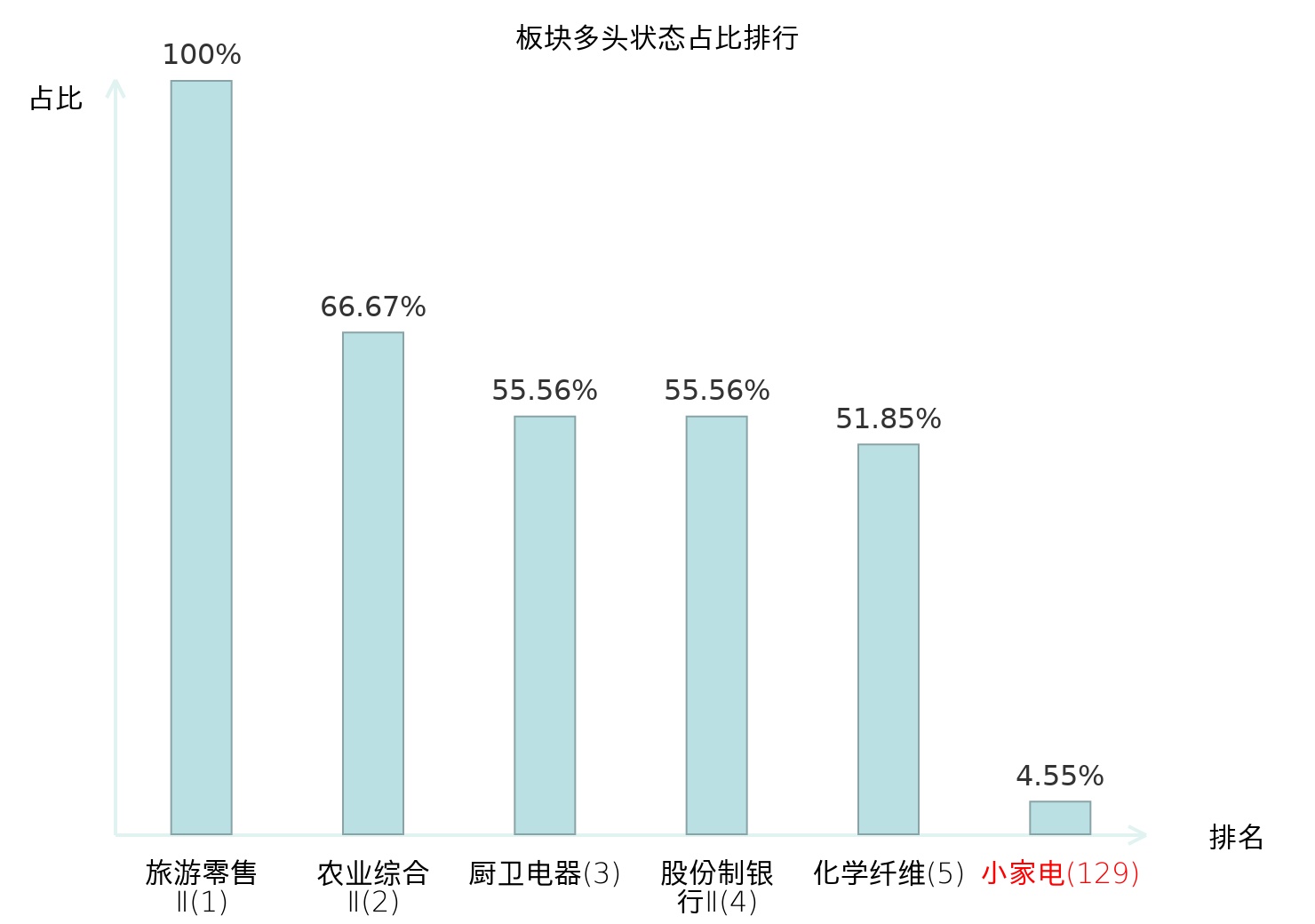 全市场所有行业板块中主力多头状态占比排名中,旅游零售Ⅱ板块位居第一。国有大型银行Ⅱ板块名次提升最快,较昨日上升103位。