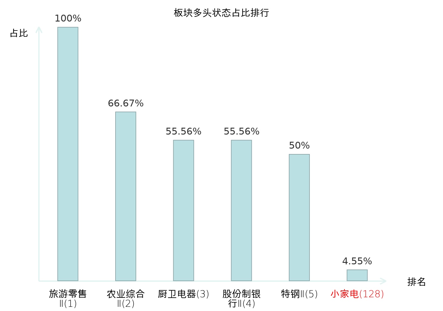 全市场所有行业板块中主力多头状态占比排名中,旅游零售Ⅱ板块位居第一。装修装饰Ⅱ板块名次提升最快,较昨日上升75位。