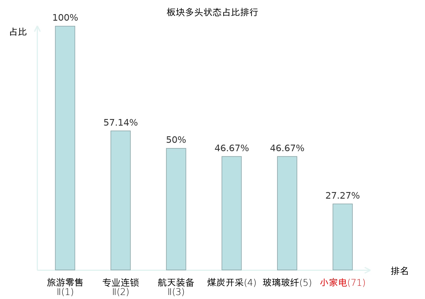 全市场所有行业板块中主力多头状态占比排名中,旅游零售Ⅱ板块位居第一。普钢板块名次提升最快,较昨日上升64位。