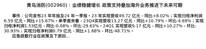 值得注意的是:2024年04月方正证券的李鲁靖分析师,首次发布关于青鸟消防的研究报告,标题为:青鸟消防(002960):业绩稳健增长 政策支持叠加海外业务推进下未来可期。