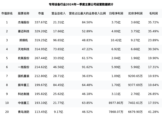 青鸟消防最新报告期数据为一季度,下表汇总了专用设备行业内市值靠前的公司一季度主要经营数据