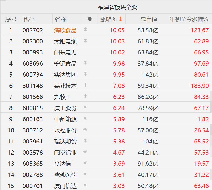 延续昨日涨势,福建股今日再度集体活跃,其中,海欣食品6连板、太阳电缆安记食品2连板、闽东电力涨停,实达集团逼近涨停,嘉戎技术涨7%,九牧王厦工股份涨超6%,中闽能源永福股份瑞达期货涨超5%。