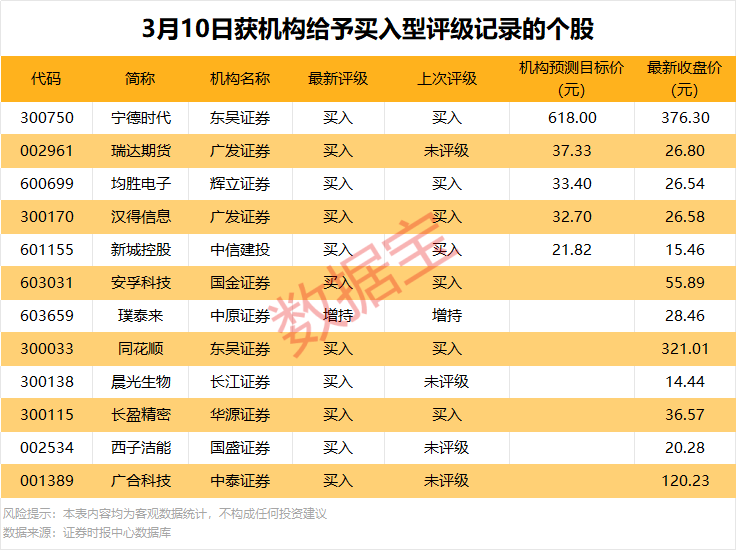 今日获机构买入型评级个股中,共有5条评级记录中对相关个股给出了预测目标价。以公布的预测目标价与最新收盘价进行对比显示,5股上涨空间均超20%,宁德时代上涨空间最高,3月10日东吴证券预计公司目标价为618元/股,上涨空间达64.23%;上涨空间较高的个股还有新城控股瑞达期货等,上涨空间分别为41.14%、39.29%。