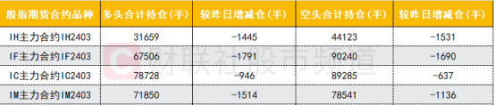 四大期指主力合约多空双方均减仓,其中IH、IF合约多空双方减仓数量基本相当;IC合约多头减仓数量大于空头;IM合约多头减仓数量大于空头。